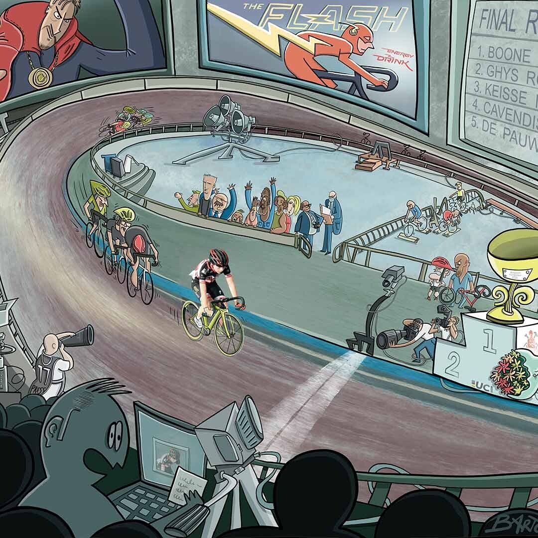 Vandaag krijgt hij een extra vleugje power in de kuiten door de magische krachten van Doctor Strange, zijn favoriete Marvel personage. Ook “The Flash” kan niet ontbreken in dit tafereeltje. De beker voor de nieuwe Belgische kampioen lonkt naar hem en hij rijdt het record van Robbe Ghys, Iljo Keisse, Mark Cavendish en Moreno De Pauw in de vernieling. De journalisten zijn sprakeloos terwijl Dario naar de finish sprint.