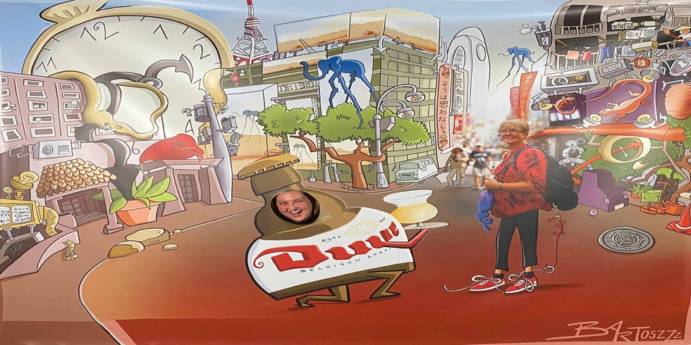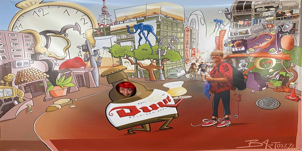 Haar levensmotto staat in het Japans te prijken op de neonreclame in de achtergrond. Met haar backpack staat ze te trappelen van ongeduld om een wereld van nieuwe avonturen in te duiken.