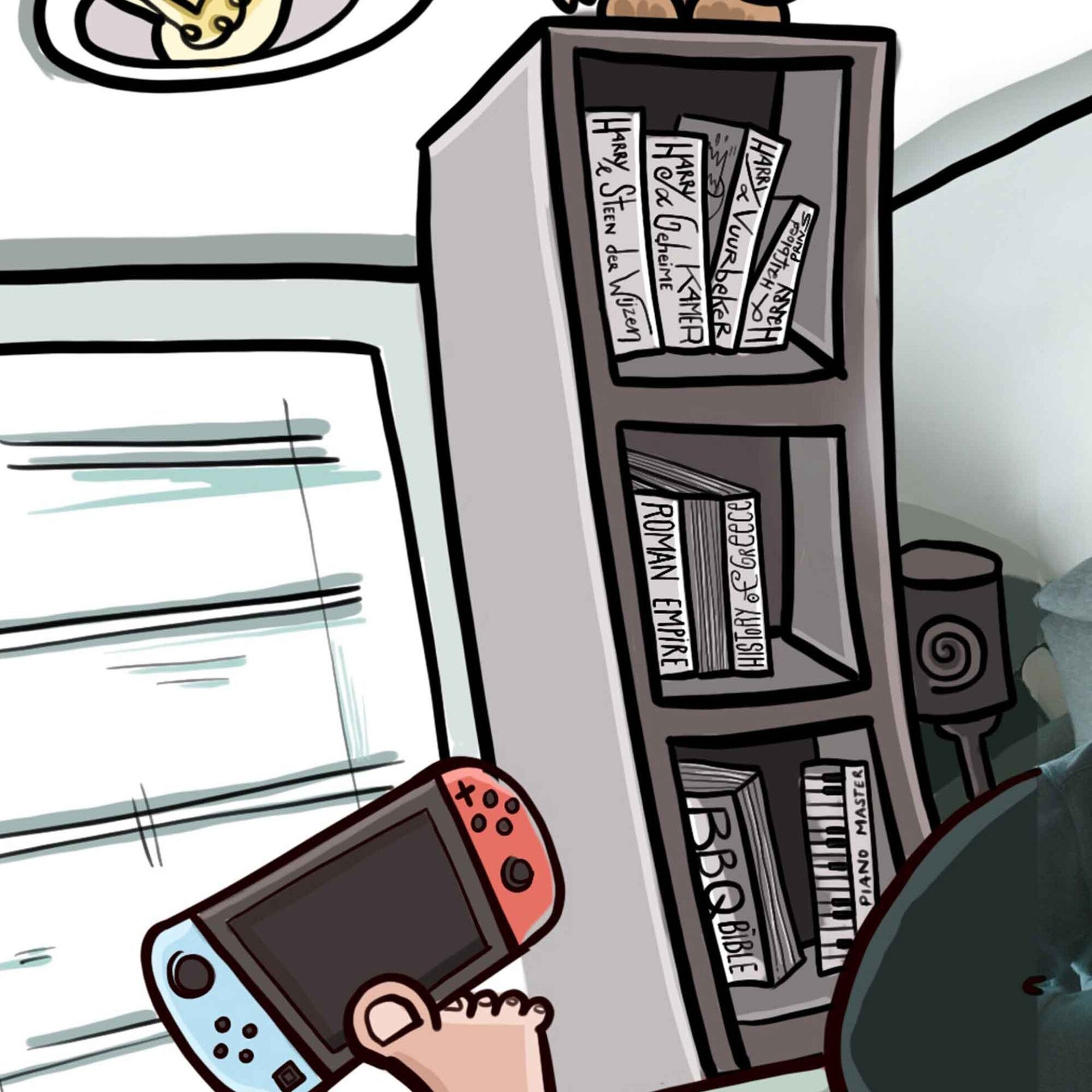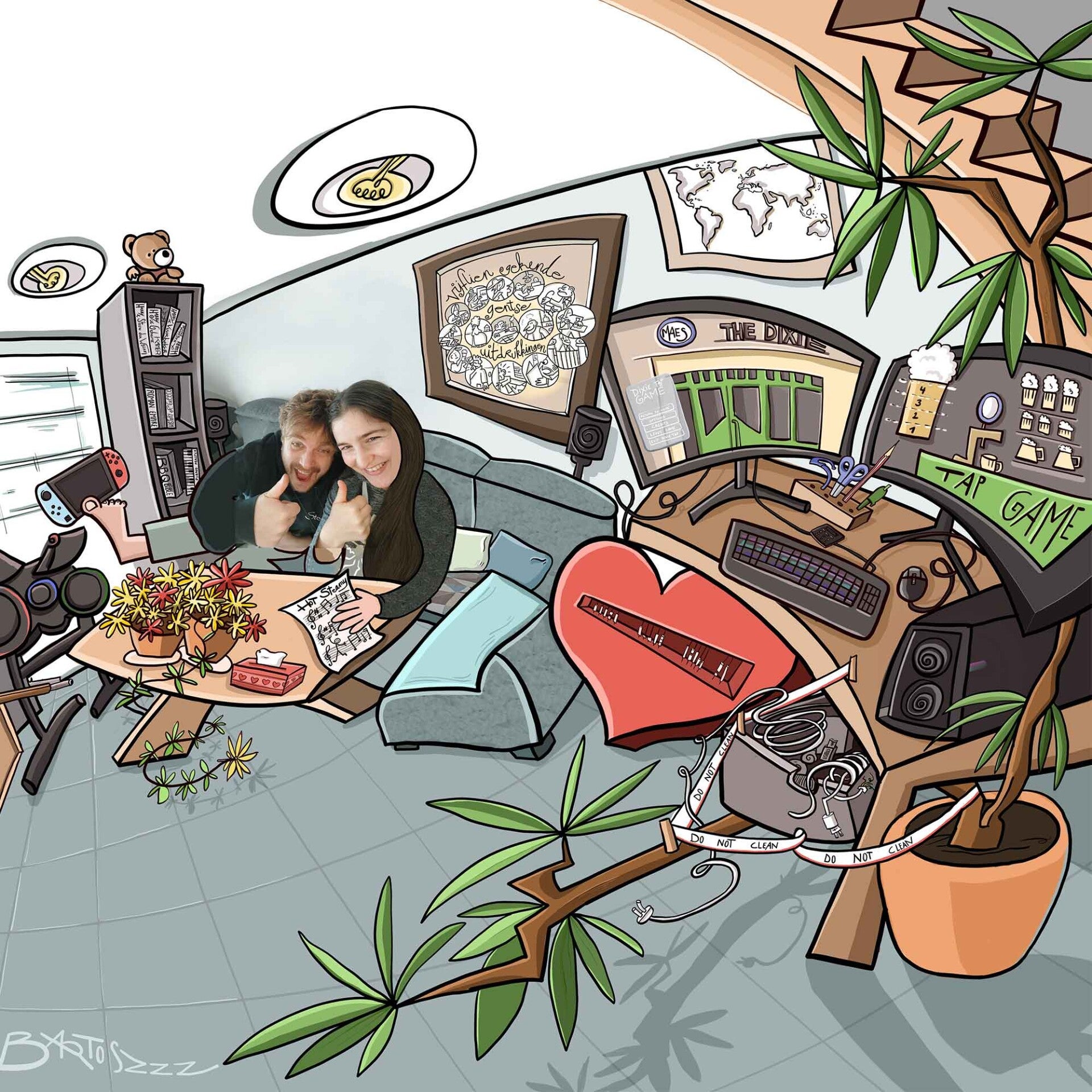 Een portret van Steven en Amy. Steven was de cafebaas van The Dixie in Gent en leerde Amy daar 17 jaar geleden kennen. Jaarlijks hadden ze een afspraak op het schietkraam op de kermis (17 witte schietbalkjes in het hart). De vonk sloeg vier jaar geleden over en sindsdien zijn ze onafscheidelijk... hun favoriete hobby; spelletjes, spelletjes en nog eens spelletjes op de console of de computer. In de kast hun favoriete boeken en muziek... aan de muur 15 erkende Gentse uitdrukkingen die uiteraard niet mogen ontbreken voor een flamboyante Gentenaar als Steven. En dat vrolijk chaotisch schuifje aan de bureau... wel daarin zat een verlovingsring verstopt. Steven had er niet op gerekend dat Amy de bureau onder handen ging nemen tijdens een schoonmaakmomentje... Ze vond de ring en Steven ging dan maar direct op de knieën. Ondertussen zijn ze gelukkig getrouwd!