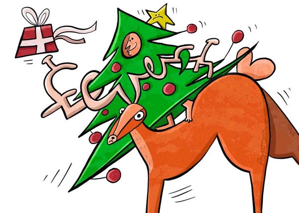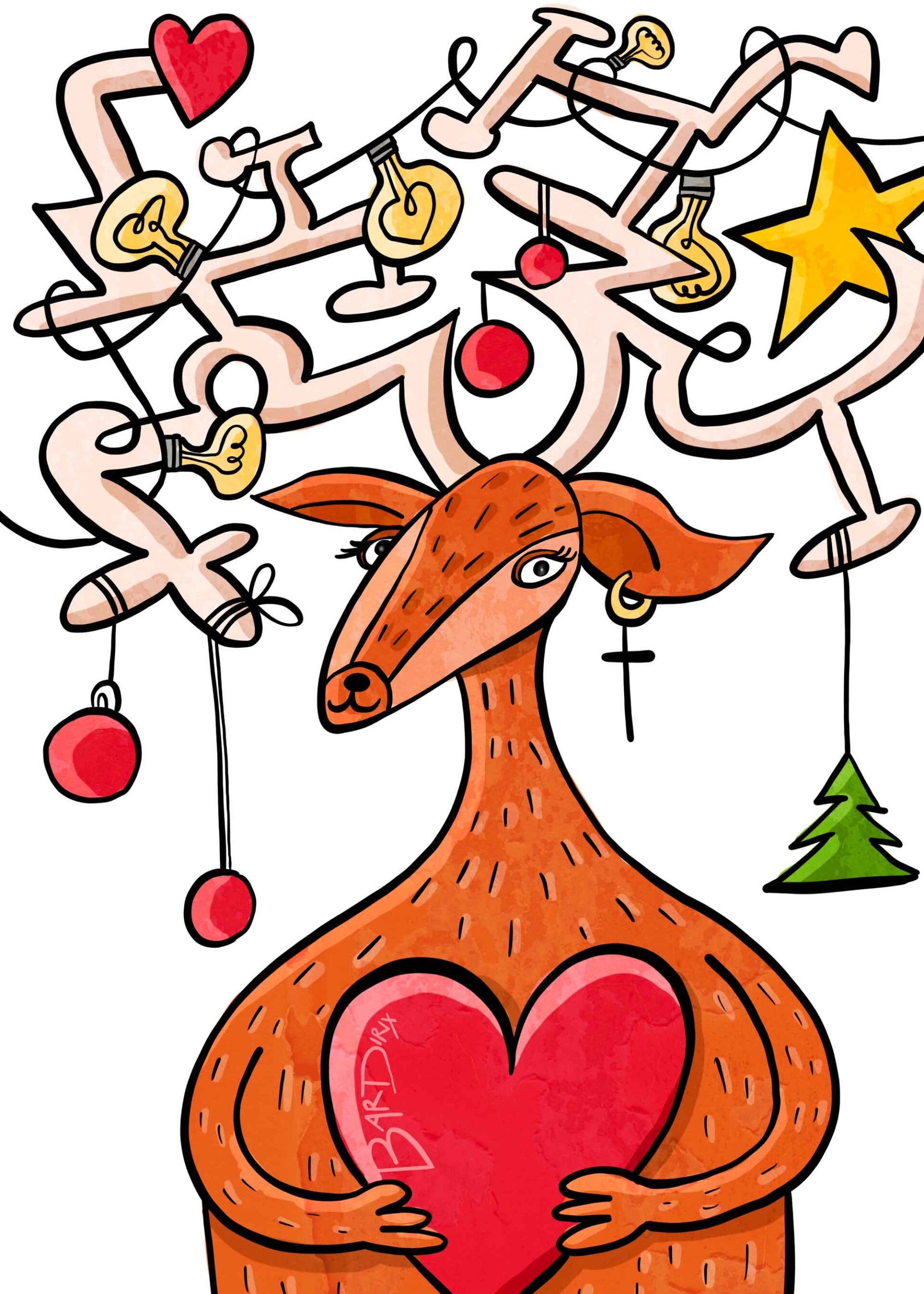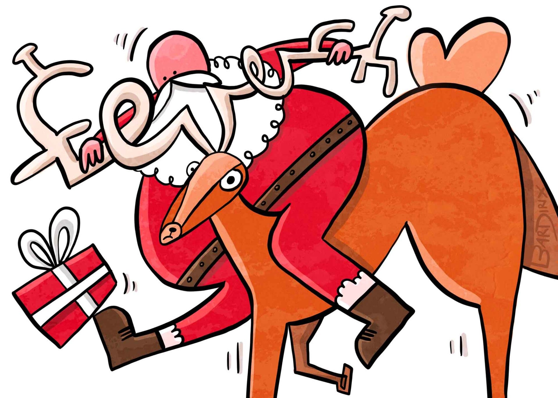 Een reeks met 5 originele postkaarten met kerstman, kerstboom en rendier.